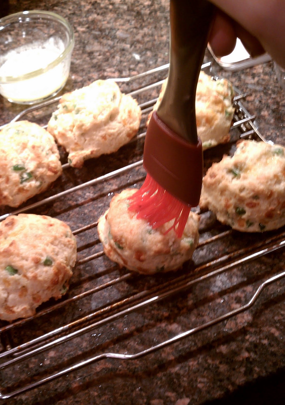 - Adjust oven rack to middle position and heat oven to 475 degrees. Whisk flour, baking powder, baking soda, sugar, salt, cheese, and jalepenos in large bowl. Combine buttermilk and 8 tablespoons melted butter in medium bowl, stirring until butter forms small clumps (see photo below).