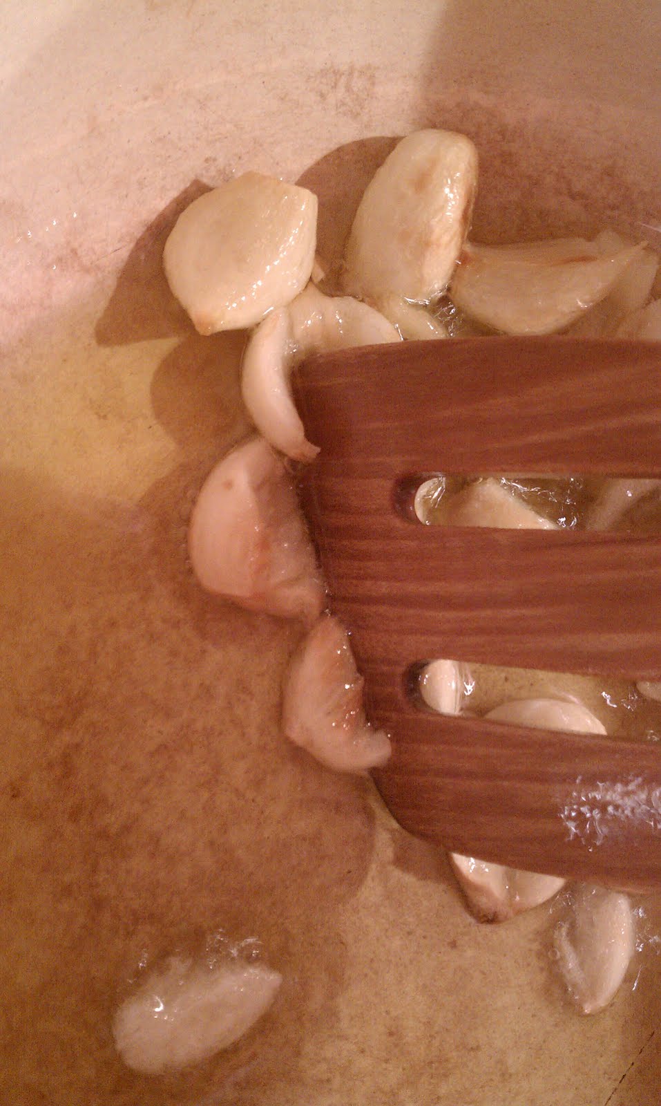 - In a large dutch oven, heat the oil and garlic over low heat, stirring, until the garlic begins to soften and turn golden, about 15 minutes. Don't rush it and burn the garlic. Break the garlic up with the back of a wooden spoon.