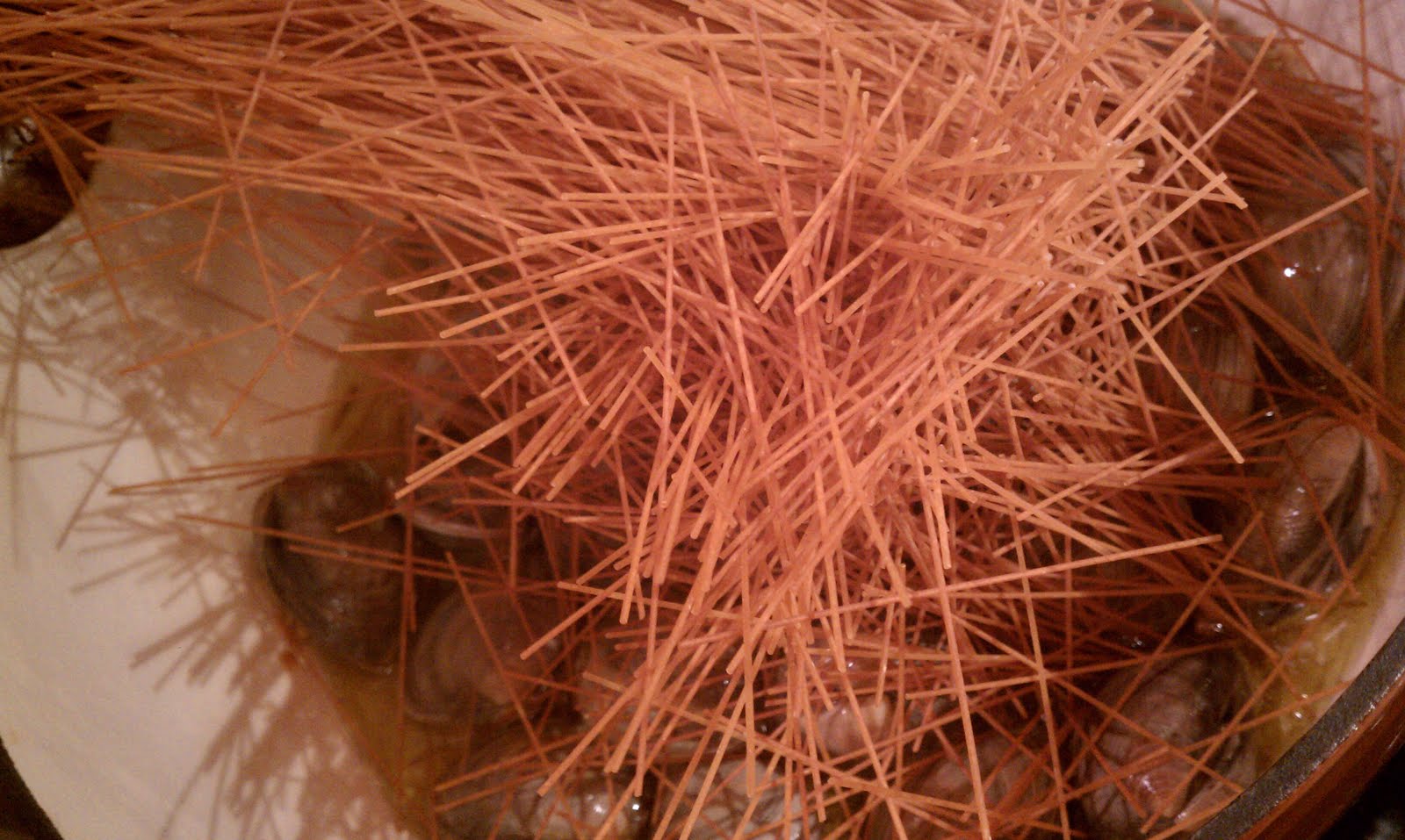 his is the first recipe TK and I ever made from the Top Chef cookbook, and it still is a regular on our menu when we're looking for something romantic, charming and relatively easy (minus the general annoyance of having to clean clams). The basic premise of very slowly cooking garlic in oil then absorbing it into toasted pasta (almost risotto style) then adding cream and saffron is pretty unbeatable. And the presentation of the just-opened clams is elegant and fun. That being said, we had to make some adjustments to the recipe (more veggies, more clams, less pasta), and work a little bit on the technique of getting a bird's nest of toasted pasta into a dutch oven. As a result, I recommend using the largest dutch oven you have, even if you aren't serving that many. (This dish serves 4 to 6).