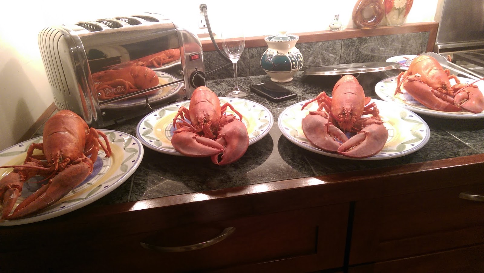The generally most anticipated part of having lobster is the killing of the lobster. Now, I think of lobsters as mutant sea bugs, so I have very little pity for them. But no one wants to make anyone suffer. We like to sedate the lobsters a little bit. We store them with wet paper towels on top in the fridge before we're ready, and then remove them one at a time and drop them in the pot. Sometimes, the fridge will be enough to make them mellow, but for particularly feisty lobsters, we put them in the freezer for about half an hour or less to sedate them. We try to minimize the time between when they are out of the fridge and when they are in the water. We submerge them completely, and feel that that is more humane than dragging it out by knifing them in the skull beforehand, though some do choose to do so.