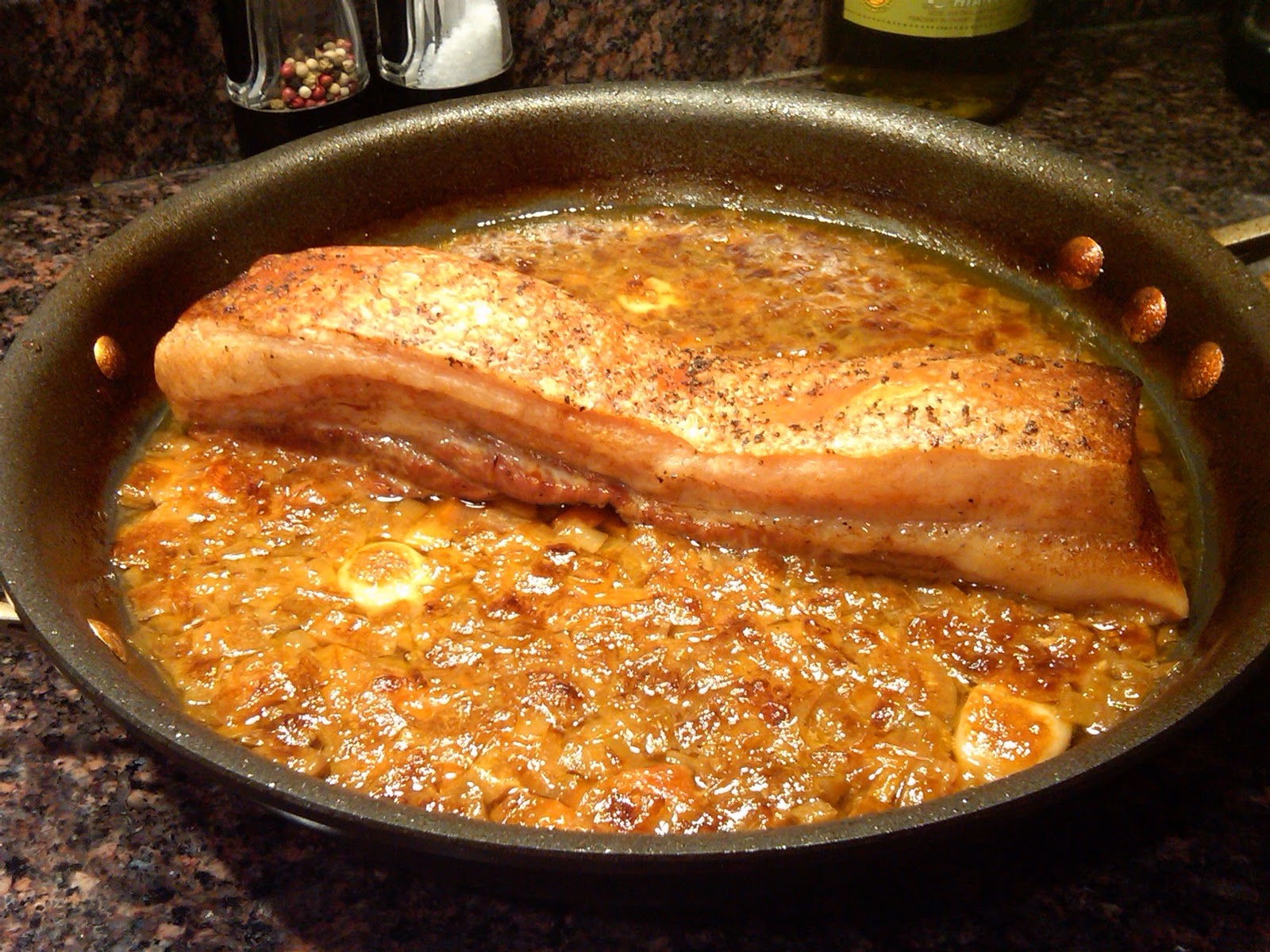- Return the pork belly to the skillet, skin side down and fat side up, and add about 2 cups of stock (it should surround but not cover the meat). Bring the stock to a simmer, then transfer the skillet to the oven.
