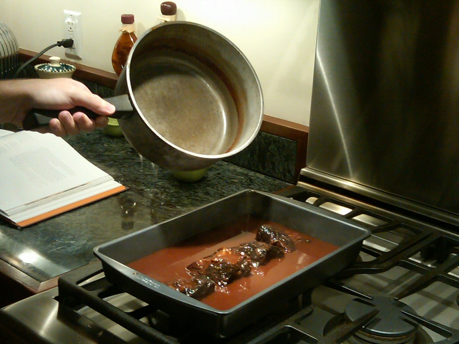 - Strain the cooking liquid through a fine-mesh strainer into a large saucepan and discard the solids. Place over medium heat, add the port, honey and tomato paste, and bring to a boil. Move the pan to one side of the burner and reduce the liquid to about 4 cups, skimming off the foam that rises to the top. When reduced, season the sauce with salt and pepper to taste and pour the sauce over the meat. At this point, the meat can be covered and refrigerated for up to a day.