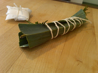 - Place the peppercorns and star anise in a small piece of cheesecloth or a small coffee filter, and tie with twine to form a bundle. Lay a piece of leek green flat on the work surface. Place the bay leaves, thyme, and rosemary in the center and cover with the remaining piece of leek. Tie together with twine. (See photos.)