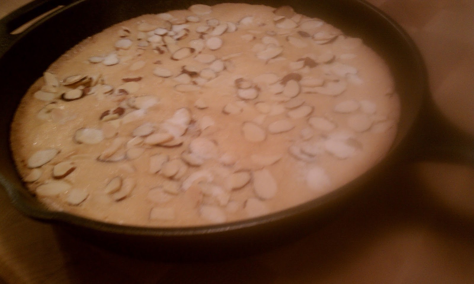 - Scatter the sliced almonds over the top and sprinkle with a little sugar (it should take between 2-3 small spoonfuls). If you're using a cake or pie pan, place the pan on a baking sheet.