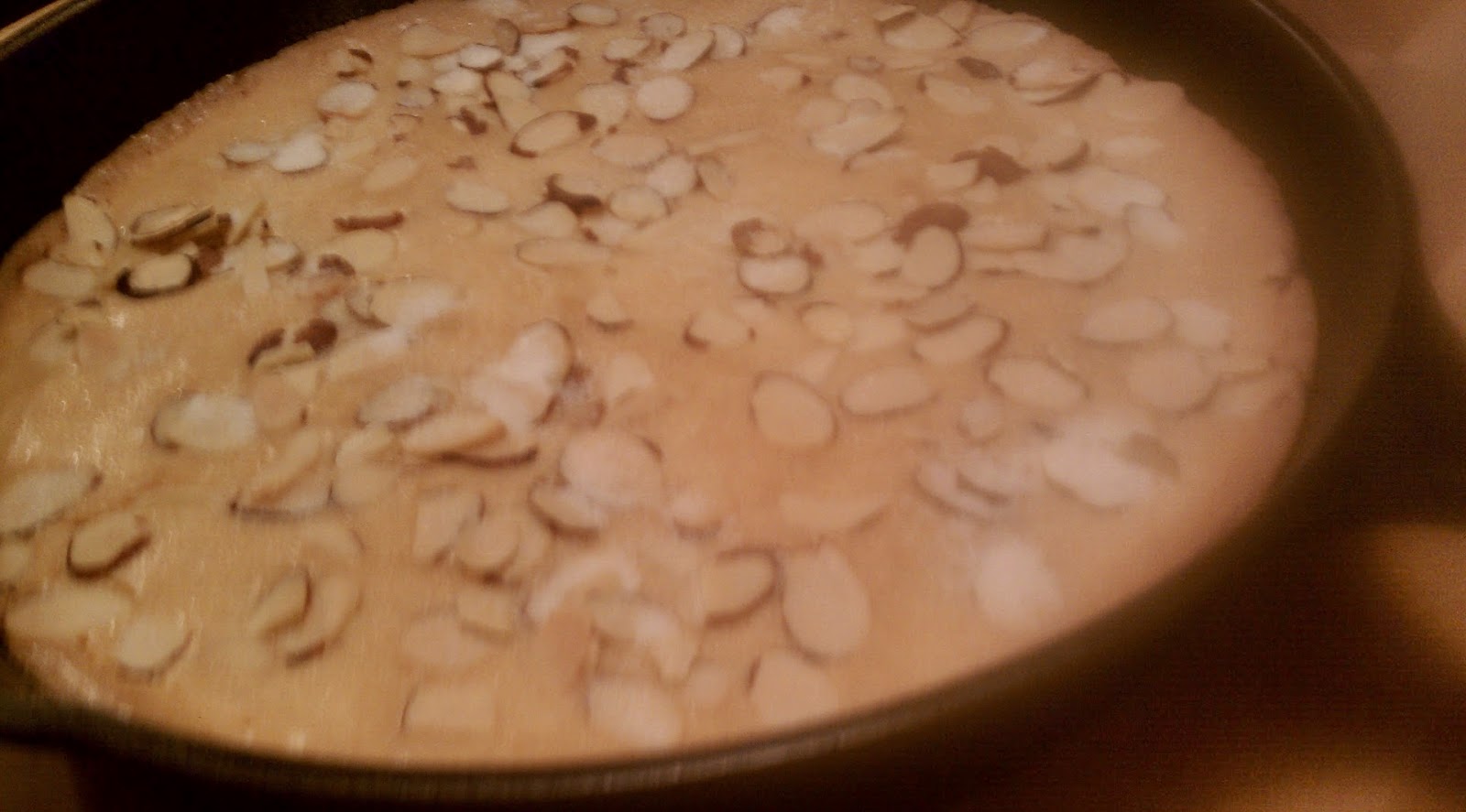 - Scatter the sliced almonds over the top and sprinkle with a little sugar (it should take between 2-3 small spoonfuls). If you're using a cake or pie pan, place the pan on a baking sheet.