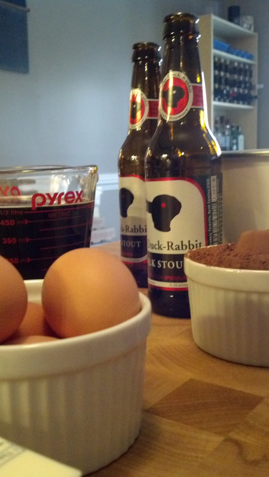 This recipe makes three layers in 8" cake pans, or 2 layers in 9" cake pans. If you are like me and get very anxious about evenly weighing your cake pans/ do not have three cake pans so need to make them in waves, I have found that 2 lbs. for each layer should be about right (1 lbs 15 3/4 oz if you are using large instead of extra large eggs) for an 8" cake. Make sure, if you are making the 9" pan, that your cake pan is at least 2" deep. If you only want to use a single can of Guinness (weighing in a 14.9 oz), you can top off the cake with water or cold coffee (as a substitute for the espresso powder). Or you can enjoy the rest of that smooth 2nd Duck Rabbit milk stout during the cooking of the cake.