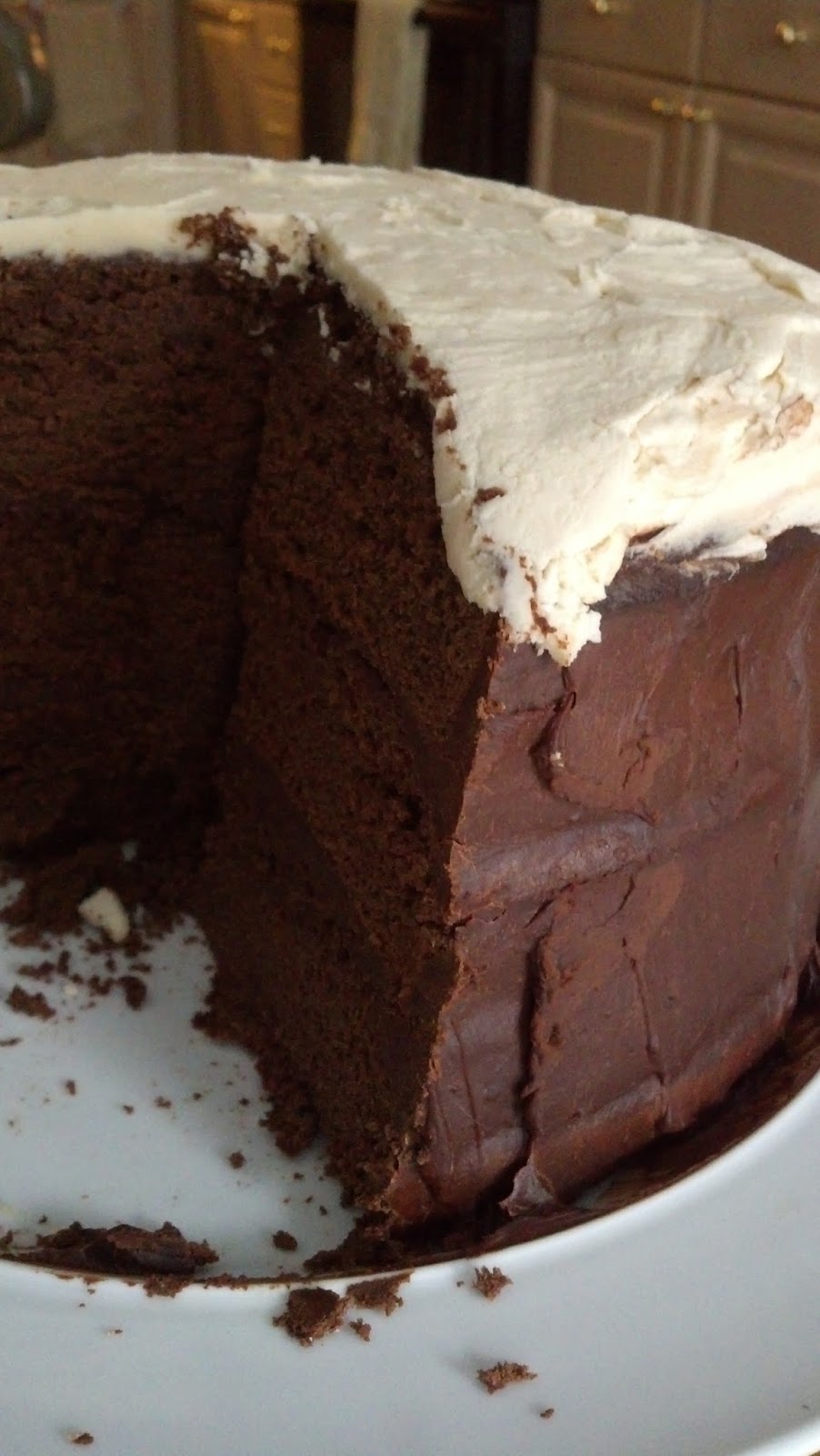 I have to admit that I had grand plans to take detailed photos of the stacking and icing of the cake, which I immediately forgot in the moment of icing. These pictures are from day three of this cake's life, after it had been hidden under foil overnight, and thus does not do the cake justice. This is a bummer. But trust me, the icing is not so hard as it seems, as you only need to rough ice this cake. You are making both the chocolate ganache and the Bailey's buttercream, but they use different methods. You don't have to cream the butter for the ganache, and the amounts come out perfectly to ice the center layers and sides in the chocolate ganache and use all of the buttercream for the top of the cake.